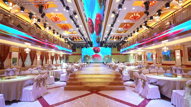 鉑金大廳—色彩濃烈,現(xiàn)代式裝修,面積560㎡,層高6米,開合大屏配合舞美燈光,唯美震撼,可承接30桌的中型宴會;12米長的可移動T臺收起后,就變成了可容納400人同時落座的大型多功能會議室。
